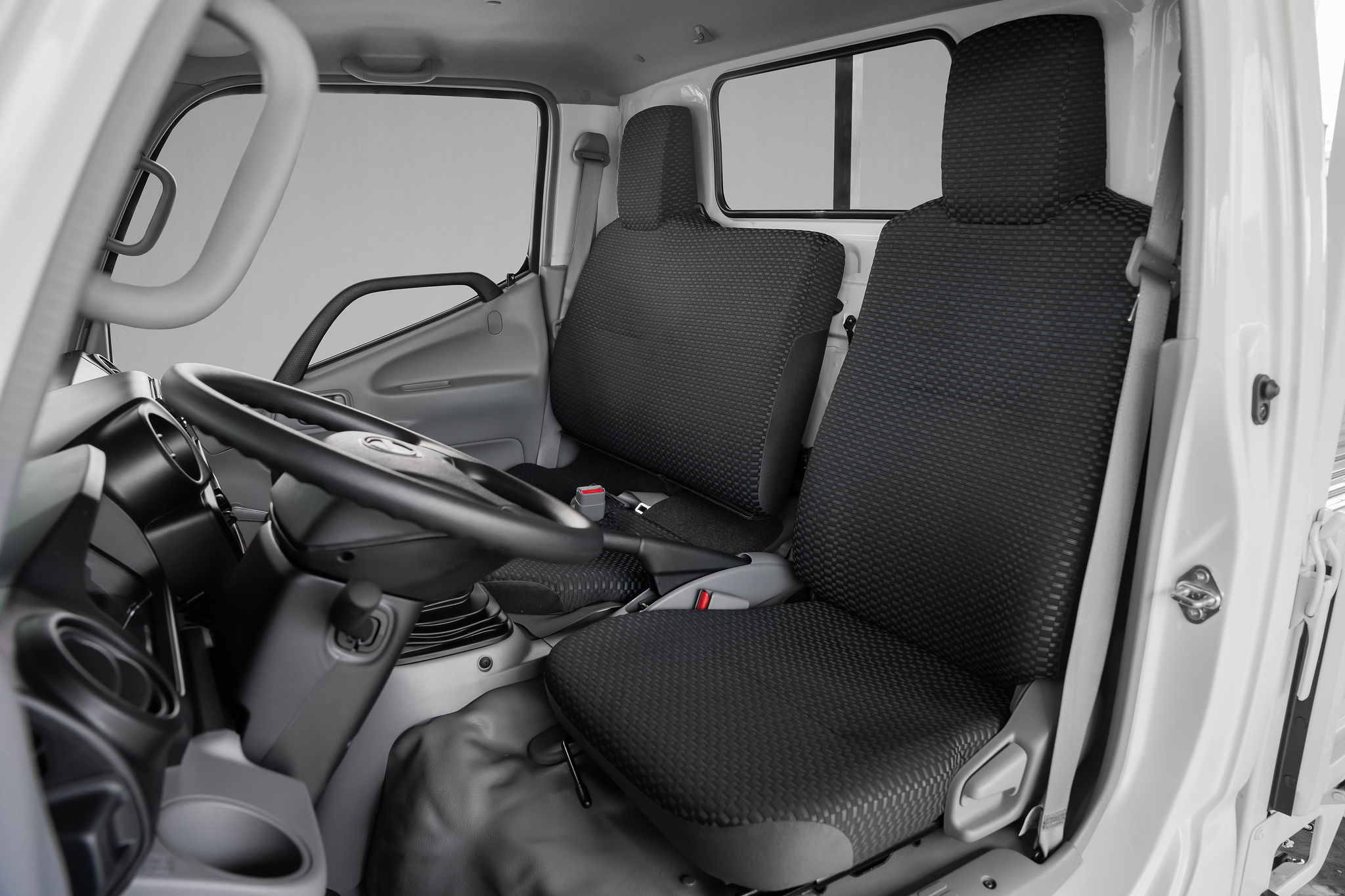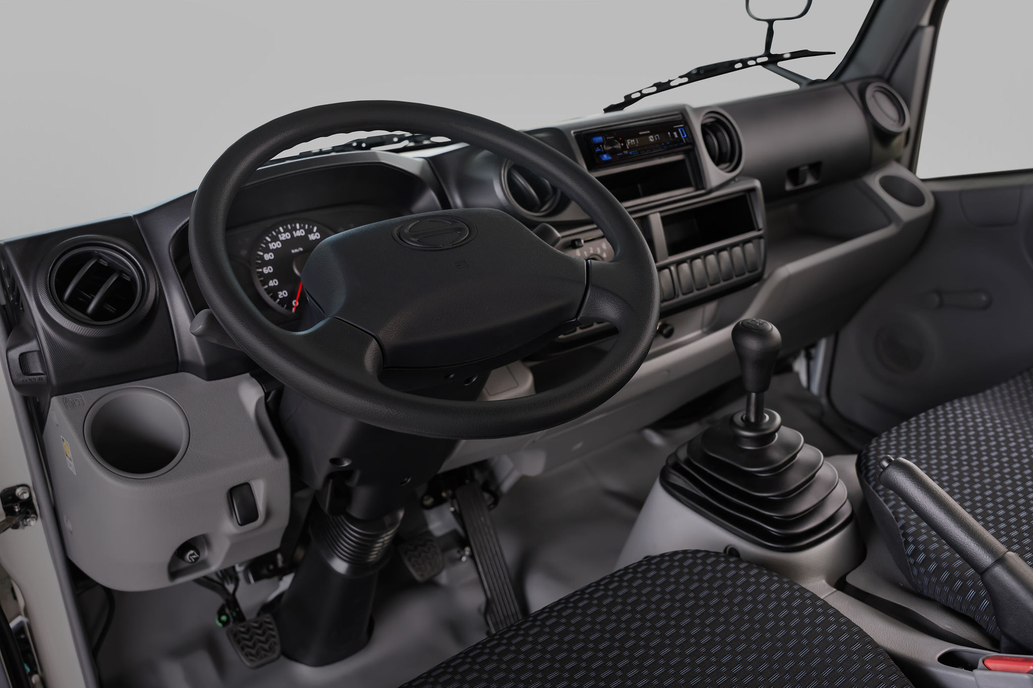 Con un interior ergonómico que incorpora tapicería de tela, timón de polipropileno y asientos tipo butaca, este camión está diseñado para ofrecer una conducción confortable y funcional.